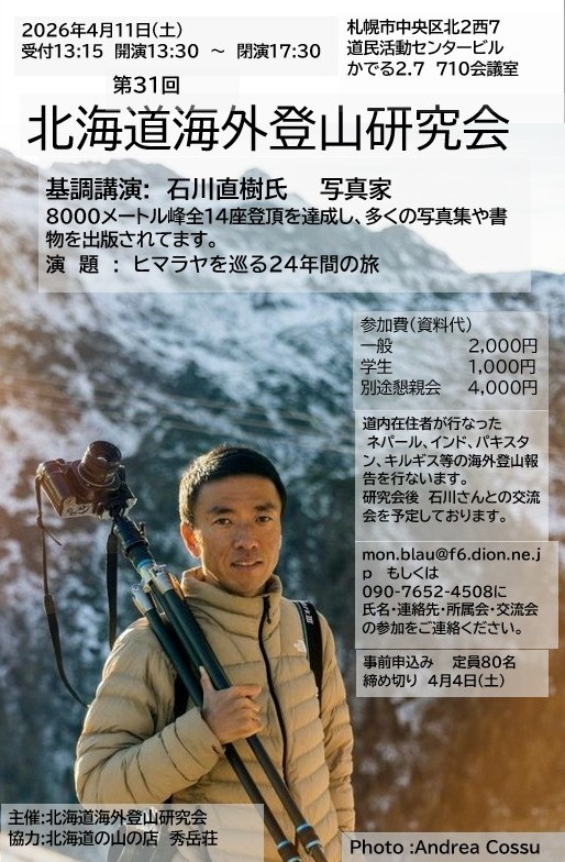 4月11日(土)かでる2・7(710会議室)で第31回 北海道海外登山研究会が開催されます。